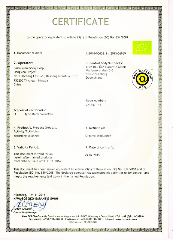伟德betvlctor1946源于英国红寺堡基地枸杞通过德国BCS有机食品认证
