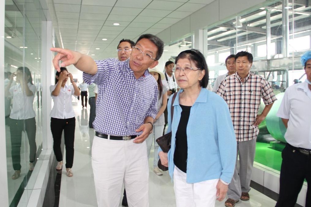 董事长郝向峰先生(左)在车间通道向黎懋明副主任(右)介绍工艺流程。